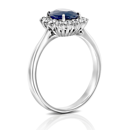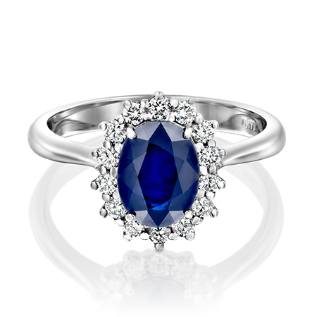 משובצת אבן ספיר כחולה גדולה ומסביבה יהלומים המעניקים לטבעת מראה עשיר ומרשים...