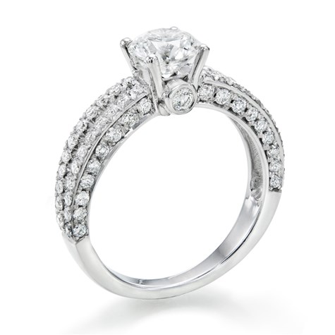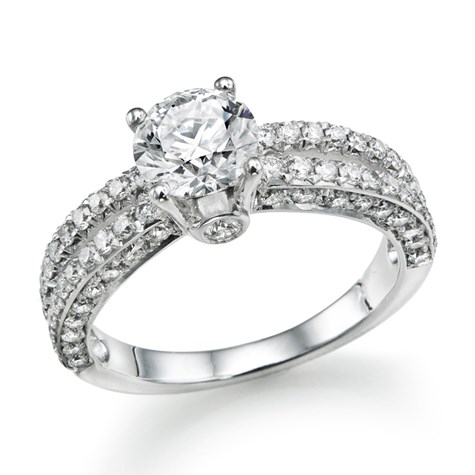 טבעת האירוסין הזו מסדרת טבעות יהלום מעוצבות, ובעלת חישוק המורכב משתי שורות של יהלומים המתנקזות אל עבר היהלום המרכזי.