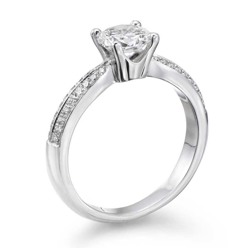 היהלום המרכזי משובץ בארבע שיניים עדינות, ומוגבה מעט על מנת לראות את מלוא יופיו הטבעי.
