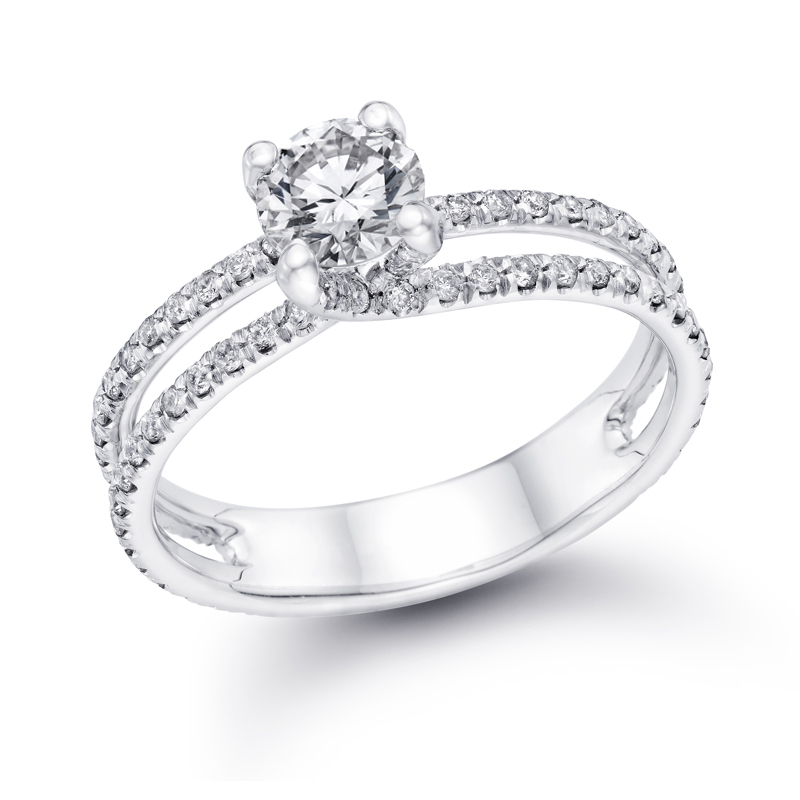 טבעת אירוסין ייחודית ועוצרת נשימה של יהלומי צד במשקל 0.38 קראט המתנקזים ליהלום המרכזי.